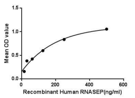 Ribonuclease P (RNASEP) is a type of ribonuclease which cleaves RNA. RNase P is unique from other RNases in that it is a ribozyme – a ribonucleic acid that acts as a catalyst in the same way that a protein based enzyme would. Its function is to cleave off an extra, or precursor, sequence of RNA on tRNA molecules. Besides, Methyl CpG Binding Protein 2 (MECP2) has been identified as an interactor of RNASEP, thus a binding ELISA assay was conducted to detect the interaction of recombinant human RNASEP and recombinant human MECP2. Briefly, RNASEP were diluted serially in PBS, with 0.01% BSA (pH 7.4). Duplicate samples of 100μL were then transferred to MECP2-coated microtiter wells and incubated for 2h at 37°C. Wells were washed with PBST and incubated for 1h with anti-RNASEP pAb, then aspirated and washed 3 times. After incubation with HRP labelled secondary antibody, wells were aspirated and washed 3 times. With the addition of substrate solution, wells were incubated 15-25 minutes at 37°C. Finally, add 50µL stop solution to the wells and read at 450nm immediately. The binding activity of RNASEP and MECP2 was shown, and this effect was in a dose dependent manner. |