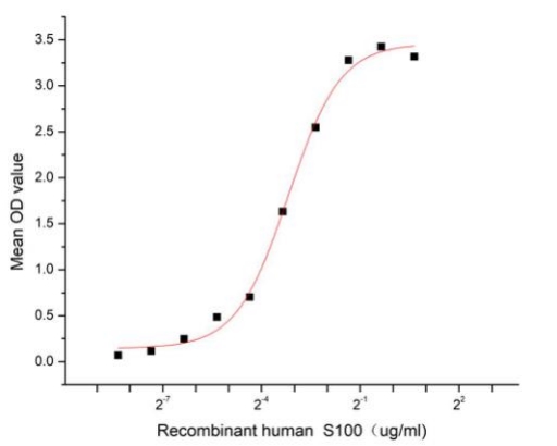 | Bio-activity : | Small calcium binding protein that S100 Calcium Binding Protein (S100), also known as S100 Alpha (S100A1), is a member of the S100 family of calcium-binding proteins. As with most S100 proteins, S100A1 proteins are localized in the cytoplasm and/or nucleus of a wide range of cells, and it possess a variety of intracellular and extracellular functions. They interact with multiple receptors and signal transducers to regulate pathways that govern inflammation, cell differentiation, proliferation, energy metabolism, apoptosis, calcium homeostasis, cell cytoskeleton and microbial resistance. S100 Calcium Binding Protein A4 (S100A4) is one of targets of S100A1. Thus a functional binding ELISA assay was conducted to detect the interaction of recombinant human S100A1 and recombinant mouse S100A4. Briefly, S100A1 was diluted serially in PBS with 0.01% BSA (pH 7.4). Duplicate samples of 100 μl were then transferred to S100A4-coated microtiter wells and incubated for 1h at 37°C. Wells were washed with PBST and incubated for 1h with anti-S100A1 pAb, then aspirated and washed 3 times. After incubation with HRP labelled secondary antibody for 1h at 37°C, wells were aspirated and washed 5 times. With the addition of substrate solution, wells were incubated 15-25 minutes at 37°C. Finally, add 50 µL stop solution to the wells and read at 450/630 nm immediately. The binding activity of recombinant human S100A1 and recombinant mouse S100A4 was shown, the EC50 for this effect is 0.11 ug/mL. |