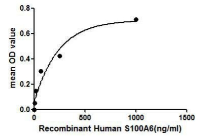 | Bio-activity : | S100A6 is a calcium-binding protein, which functions as calcium sensor and modulator, contributing to cellular calcium signaling. It is reported that S100B and S100A6 differentially modulate cell survival by Interacting with distinct RAGE(Receptor for Advanced Glycation End Products). Thus a binding ELISA assay was conducted to detect the interaction of S100A6 and RAGE. Briefly, recombinant human S100A6 were diluted serially in PBS, with 0.01%BSA (pH 7.4). Duplicate samples of 100uL were then transferred to RAGE-coated microtiter wells and incubated for 2h at 37°C. Wells were washed with PBST and incubated for 1h with anti-S100A6 mAb, then aspirated and washed 3 times. After incubation with HRP labelled secondary antibody, wells were aspirated and washed 3 times. With the addition of substrate solution, wells were incubated 15-25 minutes at 37°C. Finally, add 50μL stop solution to the wells and read at 450nm immediately. The binding activity of of S100A6 and RAGE was shown in Figure, and this effect was in a dose dependent manner. |