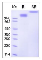 | Molecular Mass : | The protein has a calculated MW of 72.6 kDa. As a result of glycosylation, the protein migrates as 110-115 kDa under reducing (R) condition, and 220-230 kDa under non-reducing (NR) condition (SDS-PAGE). |