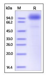 | Molecular Mass : | The protein has a calculated MW of 72.5 kDa. The protein migrates as 90-115 kDa under reducing (R) condition (SDS-PAGE) due to glycosylation. |
