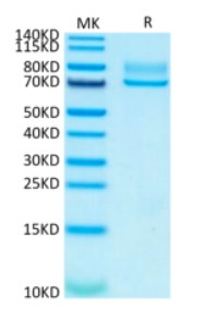 Molecular Mass : | The protein has a predicted MW of 50.6 kDa. Due to glycosylation, the protein migrates to 70-100 kDa based on Tris-Bis PAGE result. |