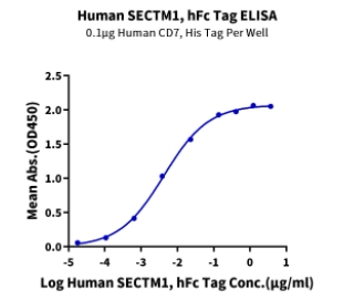| Bio-activity : | Immobilized Human CD7, His Tag at 1ug/ml (100ul/well) on the plate. Dose response curve for Human SECTM1, hFc Tag with the EC50 of 4.2ng/ml determined by ELISA. |