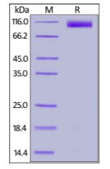 Molecular Mass : | The protein has a calculated MW of 84.8 kDa. The protein migrates as 150 kDa under reducing (R) condition (SDS-PAGE) due to glycosylation. |