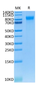 Molecular Mass : | The protein has a predicted MW of 61.6 kDa. Due to glycosylation, the protein migrates to 80-100 kDa based on Tris-Bis PAGE result. |