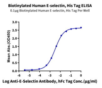 | Bio-activity : | Immobilized Biotinylated Human E-selectin, His Tag at 1ug/ml (100ul/Well) on streptavidin (5ug/ml) precoated plate. Dose response curve for Anti-E-Selectin Antibody, hFc Tag with the EC50 of 3.2ng/ml determined by ELISA. |