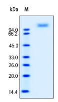 Molecular Mass : | The protein has a calculated MW of 60 kDa. The protein migrates as 110 kDa under reducing (R) condition (SDS-PAGE) due to glycosylation. |