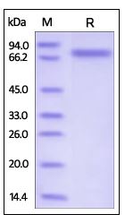 Molecular Mass : | The protein has a calculated MW of 72.7 kDa. The protein migrates as 70-80 kDa under reducing (R) condition (SDS-PAGE) due to glycosylation. |