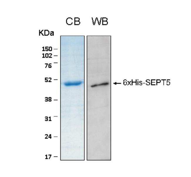 >95% confirmed by 10% SDS-PAGE stained with Coomassie Blue (CB), immunobloting with anti-6xHis (WB). |