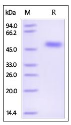| Molecular Mass : | The protein has a calculated MW of 45.2 kDa. The protein migrates as 45-55 kDa under reducing (R) condition (SDS-PAGE). |