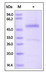 Molecular Mass : | The protein has a calculated MW of 45.3 kDa. The protein migrates as 47 kDa under reducing (R) condition (SDS-PAGE) due to glycosylation. |