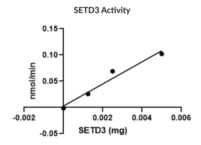 nmol/min/mg. One unit is defined as the amount of enzyme required to transfer one methyl group to actin peptide per minute using 8 µM actin peptide (LKYPIEHGIVTNWDDMEKIW-amide) at 37 centigrade in our Methyltransferase Colorimetric Assay Kit. |