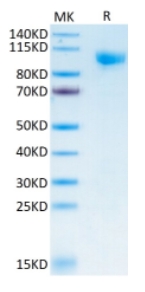| Molecular Mass : | The protein has a predicted MW of 85.8 kDa. Due to glycosylation, the protein migrates to 95-110 kDa based on Tris-Bis PAGE result. |