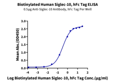 | Bio-activity : | Immobilized Anti-Siglec-10 Antibody, hFc Tag at 5ug/ml (100ul/well) on the plate. Dose response curve for Biotinylated Human Siglec-10, hFc Tag with the EC50 of 0.33ug/ml determined by ELISA. |