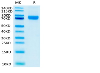 The protein has a predicted MW of 78.1 kDa. Due to glycosylation, the protein migrates to 100- 115KDa based on Bis-Tris PAGE result. |