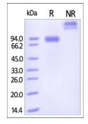 Molecular Mass : | The protein has a calculated MW of 60.3 kDa. As a result of glycosylation, the protein migrates as 80-90 kDa under reducing (R) condition, and 160-180 kDa under non-reducing (NR) condition (SDS-PAGE). |