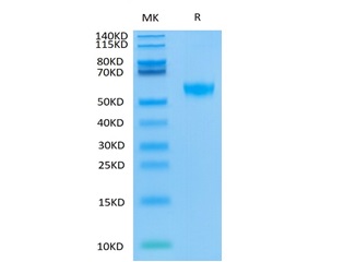 The protein has a predicted MW of 40.7 kDa.Due to glycosylation, the protein migrates to 50-60KDa based on Bis-Tris PAGE result. |