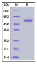 | Molecular Mass : | The protein has a calculated MW of 39.7 kDa. The protein migrates as 50-55 kDa under reducing (R) condition (SDS-PAGE) due to glycosylation. |