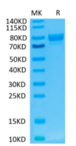 | Molecular Mass : | The protein has a predicted MW of 63.9 kDa. Due to glycosylation, the protein migrates to 75-85 kDa based on Tris-Bis PAGE result. |