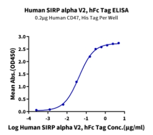 | Bio-activity : | Immobilized Human CD47, His Tag at 2ug/ml (100ul/Well). Dose response curve for Human SIRP alpha V2, hFc Tag with the EC50 of 41.9ng/ml determined by ELISA. |