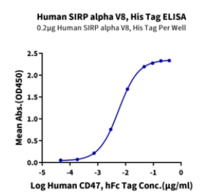 | Bio-activity : | Immobilized Human SIRP alpha V8, His Tag at 2ug/ml (100ul/Well) on the plate. Dose response curve for Human CD47, hFc Tag with the EC50 of 5.6ng/ml determined by ELISA. |