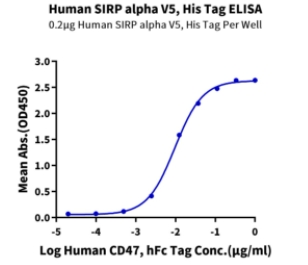 | Bio-activity : | Immobilized Human SIRP alpha V5, His Tag at 2ug/ml (100ul/Well).Dose response curve for Human CD47, hFc Tag with the EC50 of 9.7ng/ml determined by ELISA. |