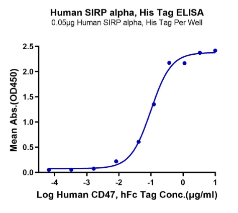 | Bio-activity : | Immobilized Human SIRP alpha, His Tag at 0.5μg/ml (100μl/Well) on the plate. Dose response curve for Human CD47, hFc Tag with the EC50 of 99.1ng/ml determined by ELISA. |