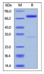 | Molecular Mass : | The protein has a calculated MW of 63.7 kDa. The protein migrates as 70-80 kDa under reducing (R) condition (SDS-PAGE) due to glycosylation. |