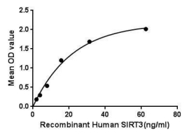 | Bio-activity : | Sirtuin 3 (SIRT3), the NAD-dependent deacetylaseis is member of the mammalian sirtuin family of proteins. In human, sirtuins have a range of molecular functions and have emerged as important proteins in aging, stress resistance and metabolic regulation. It also can regulate epigenetic genesilencing and suppress recombination of rDNA in yeast. SIRT3 expression in white and brown adipose tissue. Besides, Isocitrate Dehydrogenase2, mitochondrial (IDH2) has been identified as an interact or of SIRT3, thus a binding ELISA assay was conducted to detect the interaction of recombinant humant SIRT3 and recombinant human IDH2. Briefly, SIRT3 were diluted serially in PBS, with 0.01% BSA (pH 7.4). Duplicate samples of 100uL were then transferred to IDH2-coated microtiter wells and incubated for 2h at 37°C. Wells were washed with PBST and incubated for 1h with anti-SIRT3 pAb, thenaspirated and washed 3 times. After incubation with HRP labelled secondary antibody, wells were aspirated and washed 3 times. With the addition of substrate solution, wells were incubated 15-25 minutes at 37°C. Finally, add50µLstop solution to the wells and read at 450nm immediately. The binding activity of SIRT3 and IDH2 was shown, and this effect was in a dose dependent manner. |