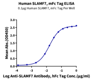 | Bio-activity : | Immobilized Human SLAMF7, mFc Tag at 1μg/ml (100μl/Well). Dose response curve for Anti-SLAMF7 Antibody, hFc Tag with the EC50 of 15.7ng/ml determined by ELISA. |