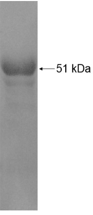 Form : | The purified protein was lyophilized from sterile phosphate-buffered saline (PBS: 58 mM Na₂HPO₄, 17 mM NaH₂PO₄, 68 mM NaCl, pH 8.0). Prior to lyophilization, 5% (w/v) trehalose and 5% (w/v) mannitol were incorporated as cryoprotective excipients. The protein was eluted with a buffer containing 100 mM reduced glutathione (GSH). |