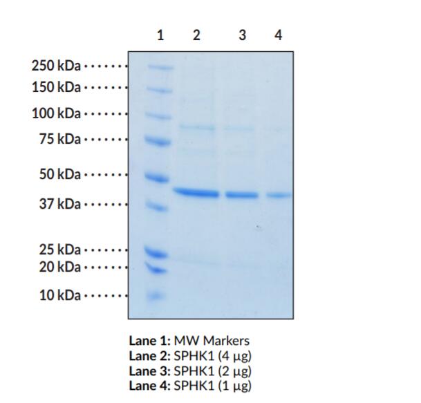 One unit is defined as the amount of enzyme required to produce 1 nmol of ADP per minute at 25 centigrade in 20 mM Hepes, pH, 7.4, containing 50 mM NaCl, 10 mM MgCl2, 1 mM EGTA and 0.02% Triton X-100 and 50 μM Sphingosine (d18:1). |