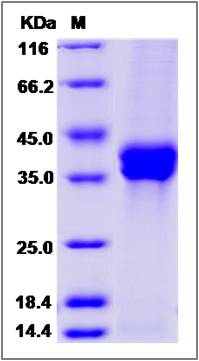 The recombinant human STC2 comprises 289 amino acids and has a predicted molecular mass of 32.1 kDa. The apparent molecular mass of the protein is approximately 35-42 kDa in SDS-PAGE under reducing conditions due to glycosylation. |