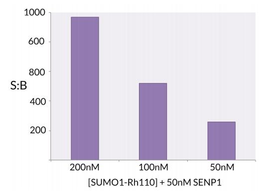 | Product Overview : | This SUMO1 substrate is C-terminally derivatized with a Glycine-Rhodamine-110 (3,6-diamino-9-(2-carboxyphenyl)) fluorophore. The Gly-Rh110 remains quenched until the amide bond between the C-terminal glycine and the Gly-Rh110 compound is hydrolyzed. The efficiency of quenching combined with the powerful signal upon hydrolysis yields a reagent with unparalleled signal-to-background. SUMO1-Rh110 can be used to study the deSUMOylating activity of hydrolases SENP1 and SENP2, or other deSUMOylating enzymes. The substrate activity of SUMO1-Rhodamine110 was determined by measuring the SENP1 catalyzed release of unquenched Gly-Rh110. The Excitation and Emission of this substrate is 485nm and 535nm respectively. |
