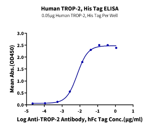 | Bio-activity : | Immobilized Human TROP-2, His Tag at 0.5 μg/ml (100 μl/Well). Dose response curve for Anti-TROP-2 Antibody, hFc Tag with the EC50 of 7.1 ng/ml determined by ELISA. |