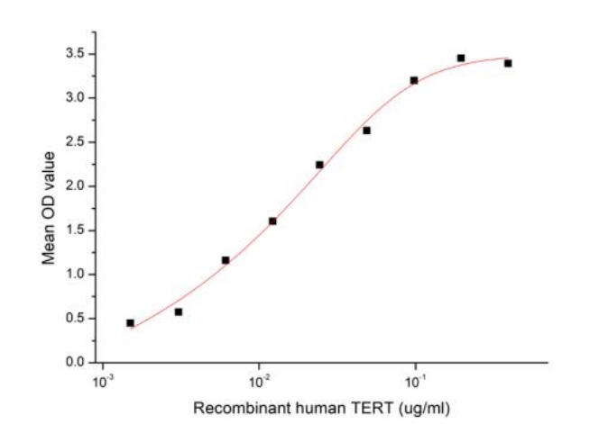 | Bio-activity : | Telomerase reverse transcriptase (TERT) is a subunit of the enzyme complex telomerase, which adds nucleotides to the ends of telomeres as they become shortened during cell division .Telomerase complex plays a key role in cancer formation by telomere dependent or independent mechanisms. According to statistics, human telomerase reverse transcriptase (h-TERT) is overexpressed in more than 85% of tumors with diverse histologies, with little expression in normal tissues. Expression of h-TERT correlates with activity of telomerase, which is required for the capacity for limitless replication, a hallmark of cancer. The X-Ray Repair Cross Complementing 6 (XRCC6) is high affinity receptor for TERT, thus a functional binding ELISA assay was conducted to detect the interaction of recombinant human TERT and recombinant rat XRCC6. Briefly, TERT was diluted serially in PBS with 0.01% BSA (pH 7.4). Duplicate samples of 100 μl were then transferred to XRCC6-coated microtiter wells and incubated for 1h at 37°C. Wells were washed with PBST and incubated for 1h with anti-TERT pAb, then aspirated and washed 3 times. After incubation with HRP labelled secondary antibody for 1h at 37°C, wells were aspirated and washed 5 times. With the addition of substrate solution, wells were incubated 15-25 minutes at 37°C. Finally, add 50 μL stop solution to the wells and read at 450/630 nm immediately. The binding activity of recombinant TERT and recombinant rat XRCC6 was shown in Figure 1, the EC50 for this effect is 0.009 ug/mL. |