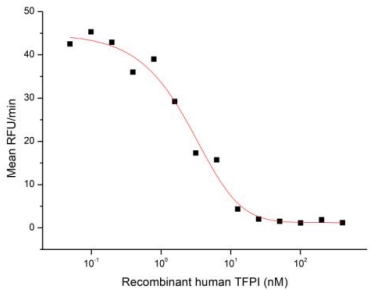Human TFPI, also known as lipoprotein-associated coagulation inhibitor (LACI) and extrinsic pathway inhibitor (EPI), is a physiological inhibitor of extrinsic pathway of coagulation and has biological functions of anticoagulation and anti-inflammation. It is a secreted protein with a N-terminal acidic region, three Kunitz (K) domains separated with by two linker regions, and a C-terminal basic region. The activity of recombinant human TFPI was measured by its ability to inhibit trypsin cleavage of a fluorogenic peptide substrate Mca-RPKPVE-Nval-WRK(Dnp)-NH2 in the assay buffer 50 mM Tris, 10 mM CaCl2, 150 mM NaCl, 0.05% (w/v) Brij-35, pH 7.5. Trypsin was diluted to 50 ug/ml in the assay buffer and 20 ul different concentrations of recombinant human TFPI (MW: 61.9 KD) was incubated with 20 ul diluted trypsin at 37°C for 15 minutes. Loading 50 µL of the incubated mixtures which were diluted five-fold in assay buffer into empty wells of a plate, and start the reaction by adding 50 µL of 20 µM substrate. Include a substrate blank containing 50 µL of assay buffer and 50 µL of 20 µM substrate. Then read at excitiation and emission wavelengths of 320 nm and 405 nm, respectively, in kinetic mode for 5 minutes. The result was shown and it was obvious that recombinant human TFPI significantly decreased trypsin activity. The inhibition IC50 was <3 nM. |