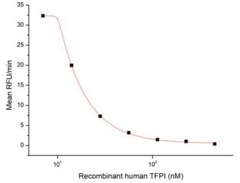 Human TFPI, also known as lipoprotein-associated coagulation inhibitor (LACI) and extrinsic pathway inhibitor (EPI), is a physiological inhibitor of extrinsic pathway of coagulation and has biological functions of anticoagulation and anti-inflammation. It is a secreted protein with a N-terminal acidic region, three Kunitz (K) domains separated with by two linker regions, and a C-terminal basic region. The activity of recombinant human TFPI was measured by its ability to inhibit trypsin cleavage of a fluorogenic peptide substrate Mca-RPKPVE-Nval-WRK(Dnp)-NH2 in the assay buffer 50 mM Tris, 10 mM CaCl2, 150 mM NaCl, 0.05% (w/v) Brij-35, pH 7.5. Trypsin was diluted to 50 ug/ml in the assay buffer and 20 ul different concentrations of recombinant human TFPI (MW: 55.58 KD) was incubated with 20 ul diluted trypsin at 37°C for 15 minutes. Loading 50 µL of the incubated mixtures which were diluted five-fold in assay buffer into empty wells of a plate, and start the reaction by adding 50 µL of 20 µM substrate. Include a substrate blank containing 50 µL of assay buffer and 50 µL of 20 µM substrate. Then read at excitiation and emission wavelengths of 320 nm and 405 nm, respectively, in kinetic mode for 5 minutes. The result was shown and it was obvious that recombinant human TFPI significantly decreased trypsin activity. The inhibition IC50 was <17 nM. |