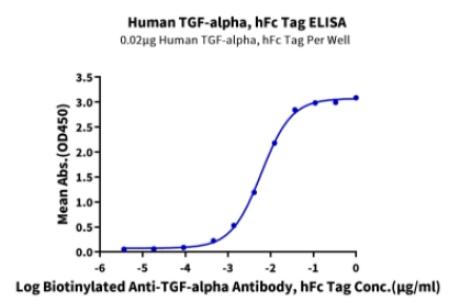 | Bio-activity : | Immobilized Human TGF-alpha, hFc Tag at 0.2ug/ml (100ul/well) on the plate. Dose response curve for Biotinylated Anti-TGF-alpha Antibody, hFc Tag with the EC50 of 6.0ng/ml determined by ELISA (QC Test). |