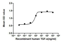 Transforming growth factor alpha (TGF-α), a ligand for the epidermal growth factor receptor, which activates a signaling pathway for cell proliferation, differentiation and development. To test the effect of TGF-α on cell proliferation of 3T3 fibroblasts, 3T3 cells were seeded into triplicate wells of 96-well plates at a density of 2, 000 cells/well and allowed to attach overnight, then the medium was replaced with serum-free standard DMEM prior to the addition of various concentrations of TGF-α. After incubated for 72h, cells were observed by inverted microscope and cell proliferation was measured by Cell Counting Kit-8 (CCK-8). Briefly, 10µL of CCK-8 solution was added to each well of the plate, then measure the absorbance at 450nm using a microplate reader after incubating the plate for 1-4 hours at 37°C. The dose-effect curve of TGF-α was shown. It was obvious that TGF-α significantly promoted cell proliferation of 3T3 cells. The ED50 for this effect is typically 0.6198 to 8.210ng/mL. |