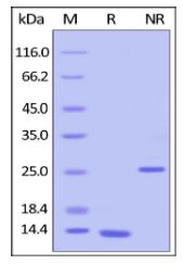Molecular Mass : | The protein has a calculated MW of 12.8 kDa (monomer). The protein migrates as 14 kDa (monomer) under reducing (R) condition, and 25 kDa (Dimer) under non-reducing (NR) condition (SDS-PAGE). |