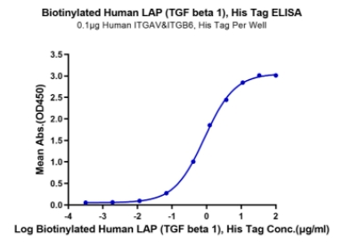 | Bio-activity : | Immobilized Human ITGAV&ITGB6, His Tag at 1μg/ml (100μl/well) on the plate. Dose response curve for Biotinylated Human LAP (TGF beta 1) , His Tag with the EC50 of 0.86μg/ml determined by ELISA. |