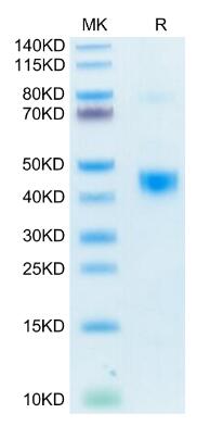 Molecular Mass : | The protein has a predicted MW of 31.4 kDa. Due to glycosylation, the protein migrates to 45-50 kDa based on Tris-Bis PAGE result. |
