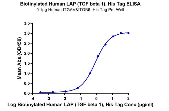 | Bio-activity : | Immobilized Human ITGAV&ITGB6, His Tag at 1μg/ml (100μl/well) on the plate. Dose response curve for Biotinylated Human LAP (TGF beta 1) , His Tag with the EC50 of 0.86μg/ml determined by ELISA. |