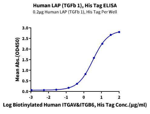 | Bio-activity : | Immobilized Human LAP (TGF beta 1) , His Tag at 2μg/ml (100μl/well) on the plate. Dose response curve for Biotinylated Human ITGAV&ITGB6, His Tag with the EC50 of 1.0μg/ml determined by ELISA. |