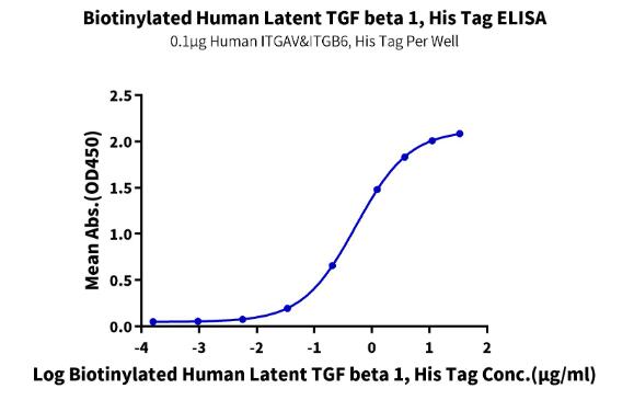 | Bio-activity : | Immobilized Human ITGAV&ITGB6, His Tag at 1μg/ml (100μl/Well) on the plate. Dose response curve for Biotinylated Human Latent TGF beta 1, His Tag with the EC50 of 0.53μg/ml determined by ELISA. |
