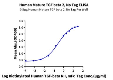 | Bio-activity : | Immobilized Human Mature TGF beta 2, No Tag at 5ug/ml (100ul/Well) on the plate. Dose response curve for Biotinylated Human TGF-beta RII, mFc Tag with the EC50 of 0.28ug/ml determined by ELISA (QC Test). |