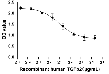 Transforming Growth Factor Beta 2 (TGFB2) belongs to TGF-beta family. As a secreted protein and a cytokine, TGFB2 plays a role in the formation of blood vessels, the regulation of muscle tissue and body fat development, wound healing, and immune system function. Besides, TGFB2 regulates cell proliferation, differentiation, adhesion, migration by transducing the signal through transmembrane receptors type I and type II (TGFBR1 and TGFBR2). To test the effect of TGFb2 on inhibit IL4-dependent proliferation, CTLL-2 cells were seeded into triplicate wells of 96-well plates, the medium was 2% serum RPMI-1640 including various concentrations of recombinant human TGFb2. After incubated for 72h, cells were observed by inverted microscope and cell proliferation was measured by Cell Counting Kit-8 (CCK-8). Briefly, 10 µl of CCK-8 solution was added to each well of the plate, then the absorbance at 450 nm was measured. Cell viability was assessed by CCK-8 assay. It was obvious that TGFB2 significantly decreased cell viability of CTLL-2 cells. The ED50 of recombinant human TGFB2 is 1.95μg/mL. |