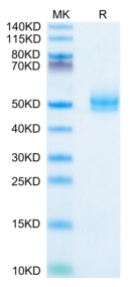 Molecular Mass : | The protein has a predicted MW of 38.2 kDa. Due to glycosylation, the protein migrates to 50-55 kDa based on Tris-Bis PAGE result. |