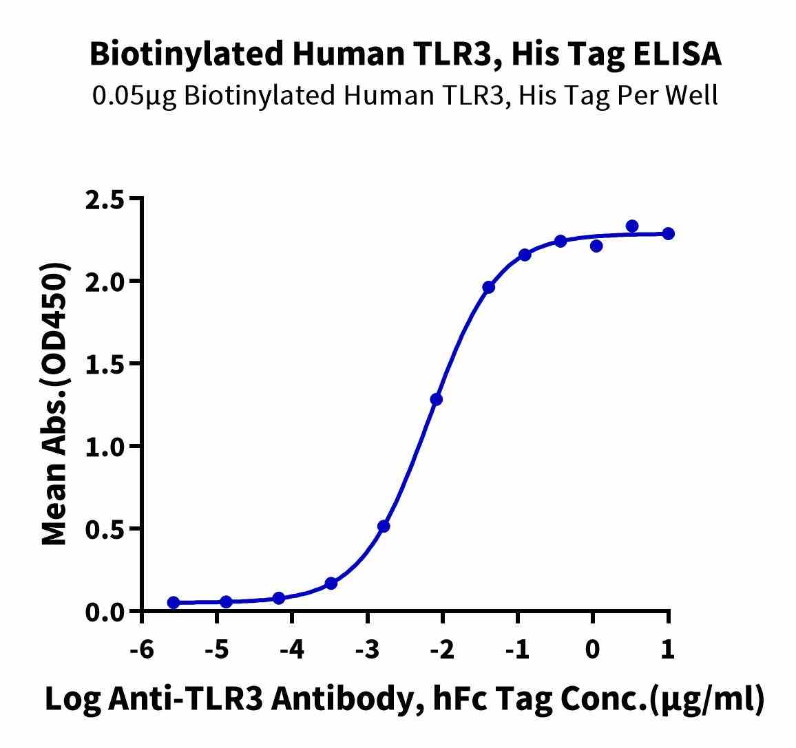 | Bio-activity : | Immobilized Biotinylated Human TLR3, His Tag at 0.5μg/ml (100μl/well) on the streptavidin precoated plate (5μg/ml). Dose response curve for Anti-TLR3 Antibody, hFc Tag with the EC50 of 6.6ng/ml determined by ELISA. |
